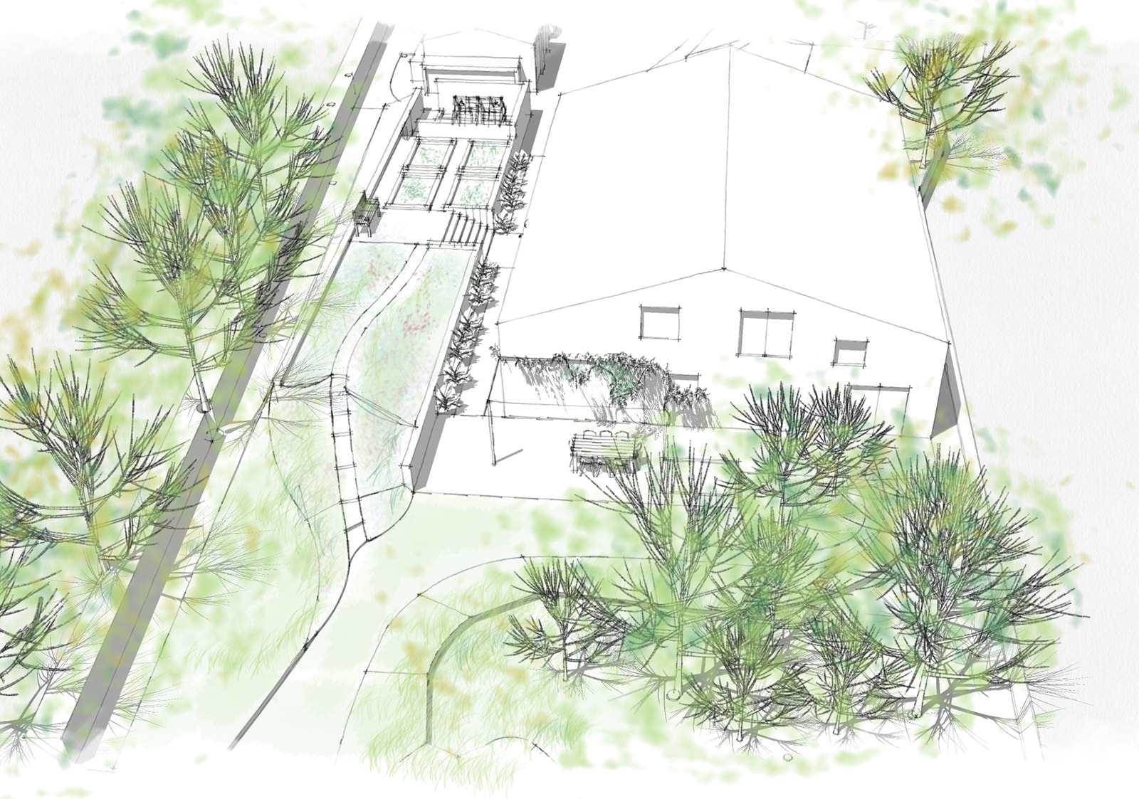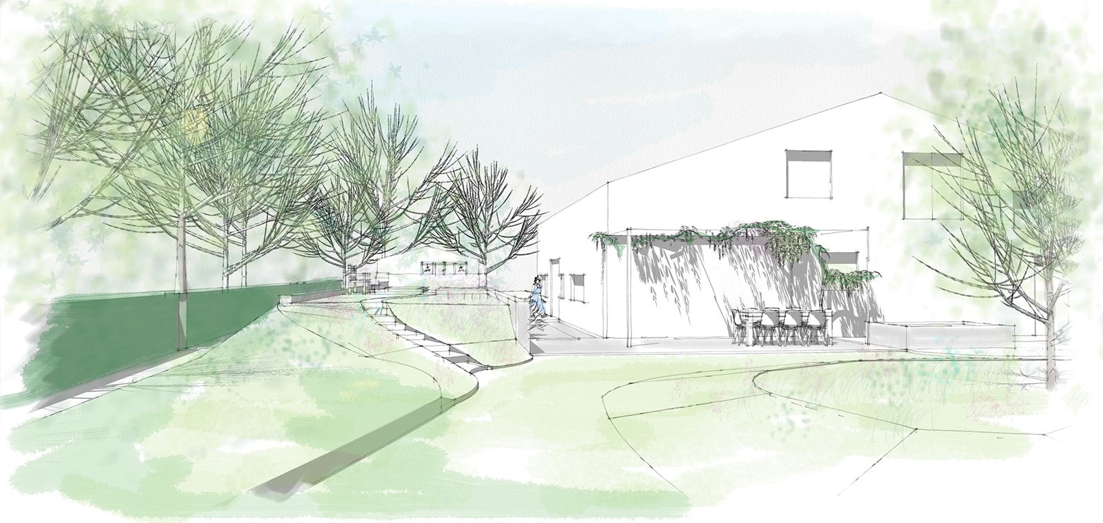 The brief is to create a private garden which connected to the surrounding farmland views. The surrounding contaminated soils needed to be treated or buried on site. The solution was to build two parallel retaining walls, back filled with the contaminated soils and topped with new soil. To the North the soils removed for a lined pond and the soils treated with a willow coppice system.